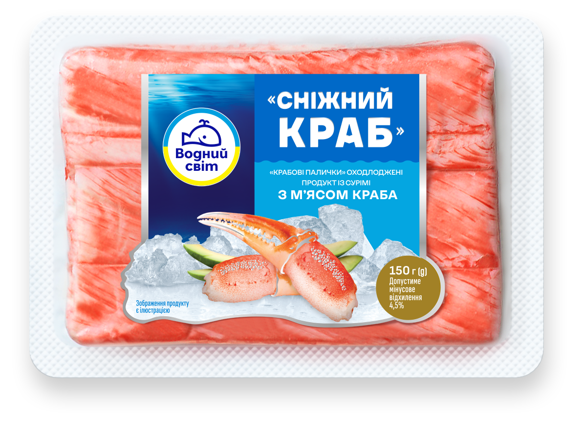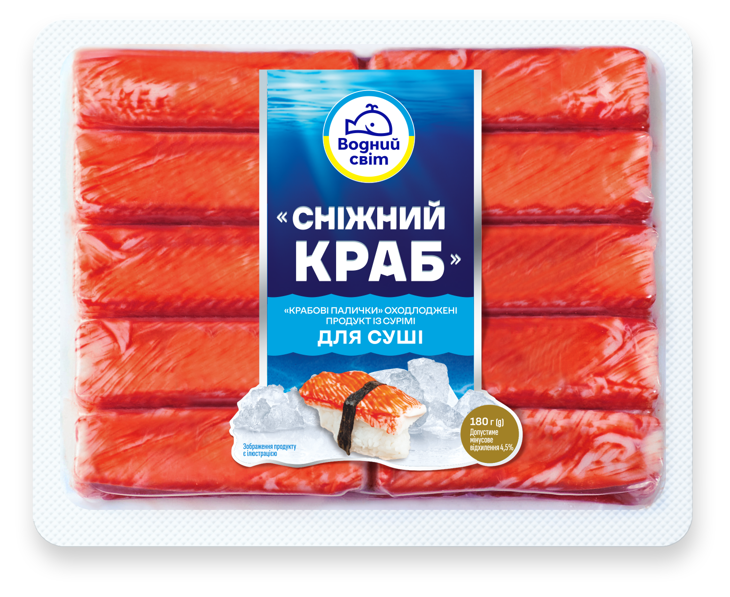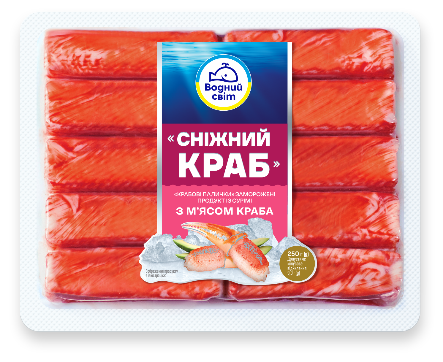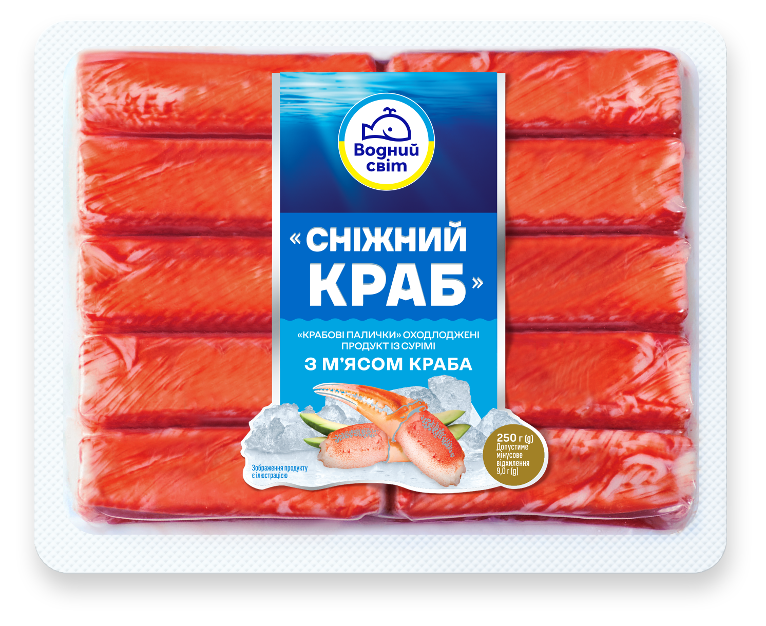”Сніжний краб” – це охолоджені та заморожені крабові палички з вмістом м’яса норвезького краба, преміальний продукт з лінійки крабових паличок ТМ ”Водний світ”. З додаванням крабових паличок ”Сніжний краб” ваше блюдо стане дуже корисним і делікатесним.