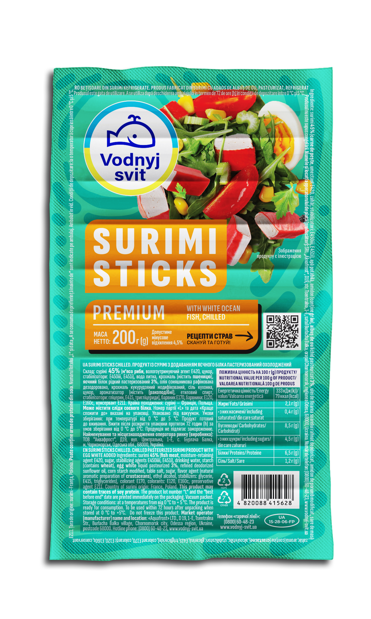 Преміальна новинка від «Водного світу» з яскравим дизайном, що відразу привертає увагу. Продукт вирізняється високим вмістом сурімі — 45%, завдяки якому палички мають ще більш виражений смак та щільну текстуру.