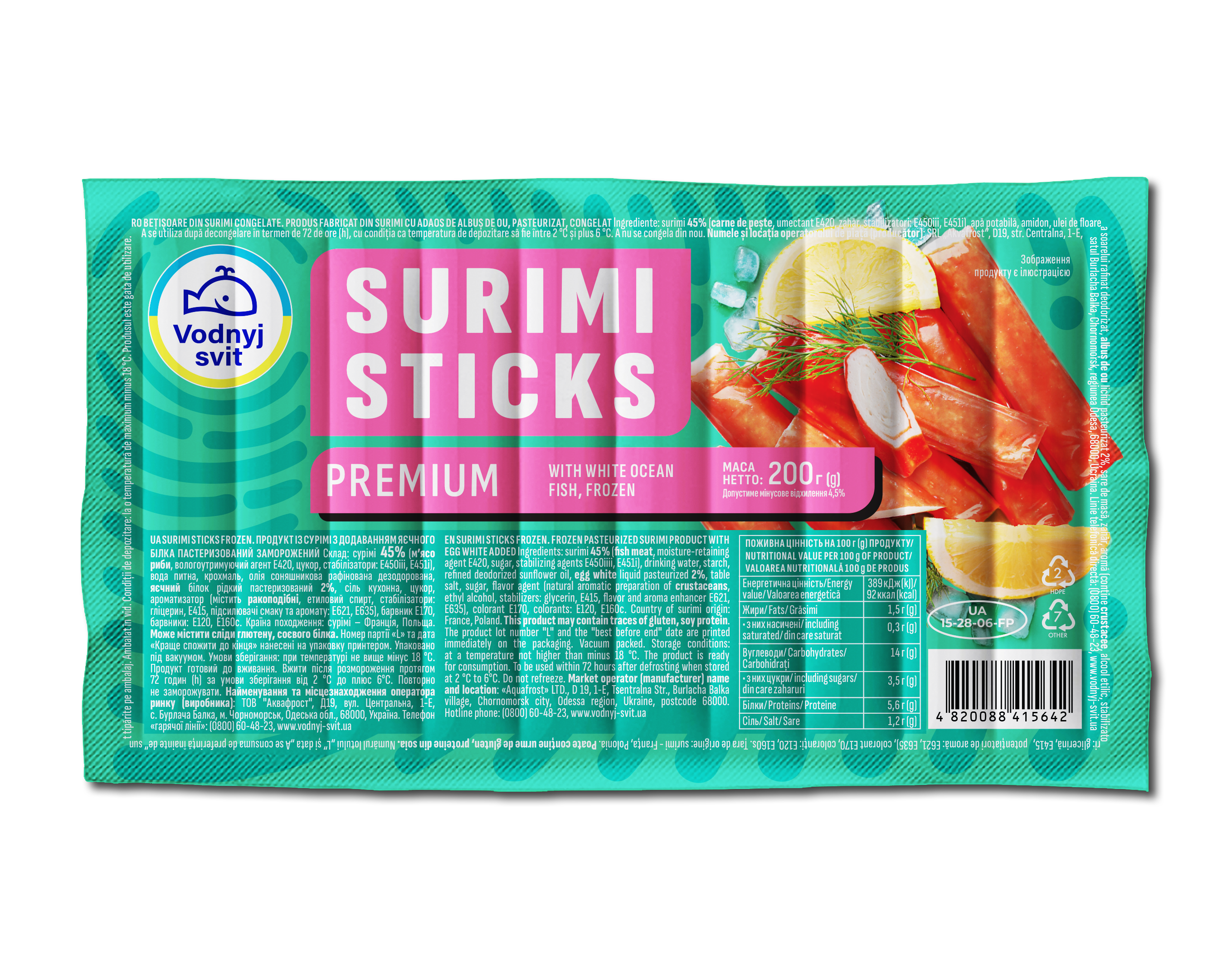 Преміальна новинка від «Водного світу» з яскравим дизайном, що відразу привертає увагу. Продукт вирізняється високим вмістом сурімі — 45%, завдяки якому палички мають ще більш виражений смак та щільну текстуру.